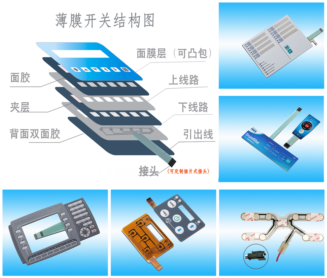 創(chuàng)銘電子可定制生產(chǎn)超大尺寸薄膜開(kāi)關(guān)、薄膜按鍵、圖形覆蓋層、薄膜電路、LED背光薄膜開(kāi)關(guān)、LGF背光薄膜開(kāi)關(guān)、EL背光薄膜開(kāi)關(guān)、電容薄膜開(kāi)關(guān)、橡膠按鍵薄膜開(kāi)關(guān)、FPC電路薄膜開(kāi)關(guān)、PCB電路薄膜開(kāi)關(guān),PCB集成電路薄膜開(kāi)關(guān)、金屬后面板薄膜開(kāi)關(guān),亞克力/PC后面板薄膜開(kāi)關(guān),防水薄膜開(kāi)關(guān),防紫外線膜開(kāi)關(guān),防刮薄膜開(kāi)關(guān),數(shù)字印刷薄膜開(kāi)關(guān)等所有應(yīng)用領(lǐng)域: